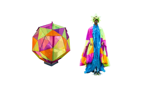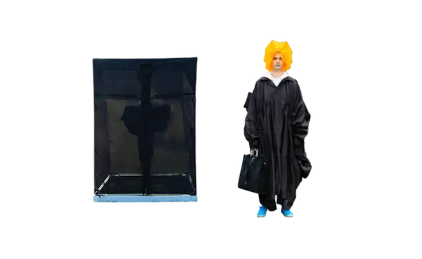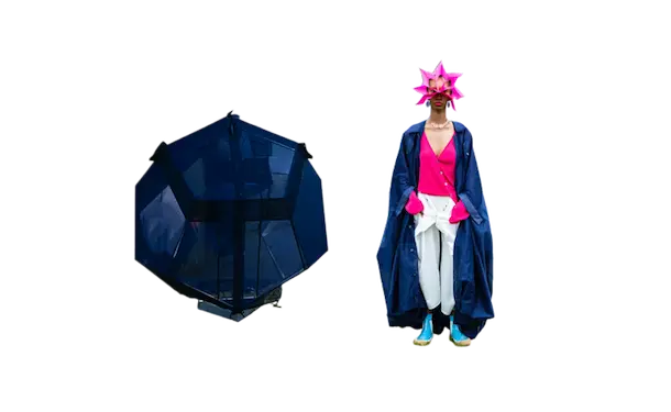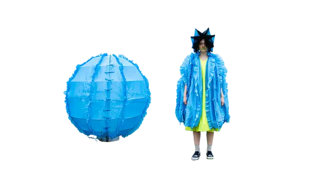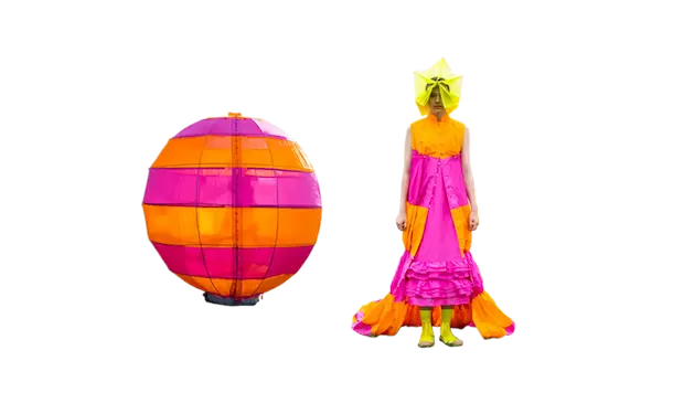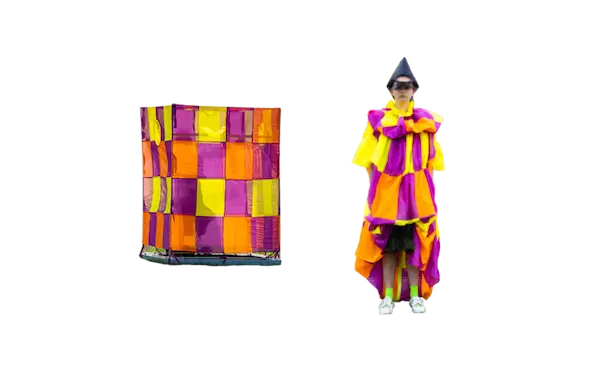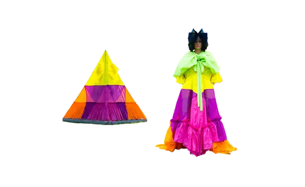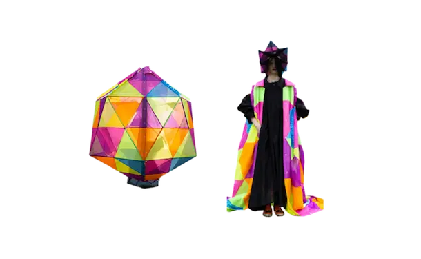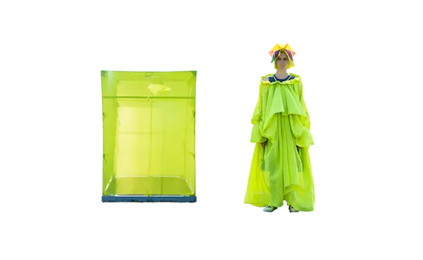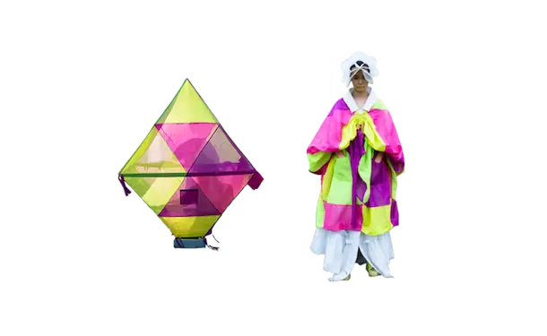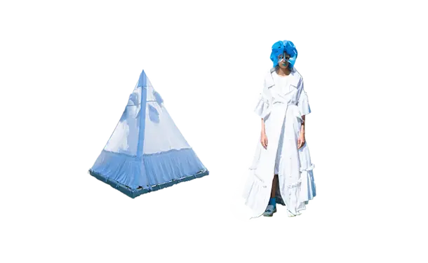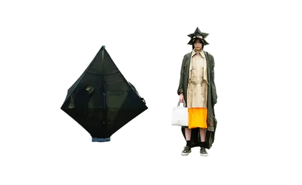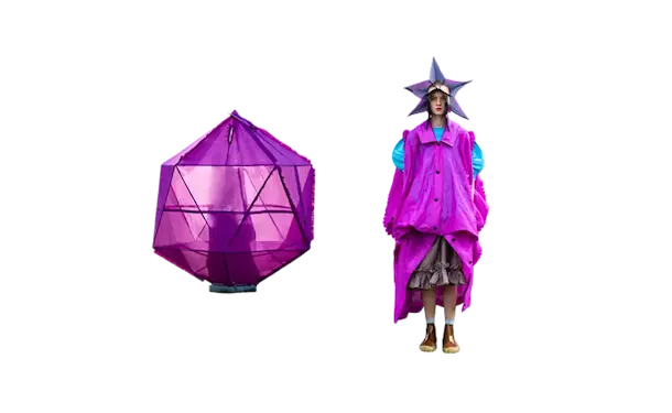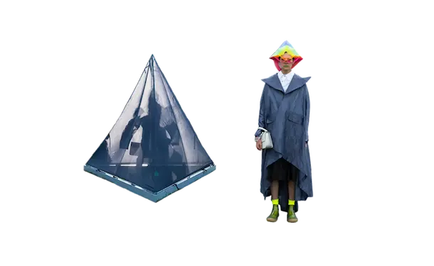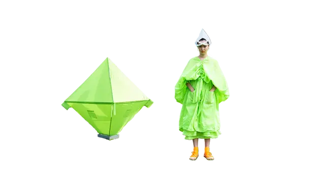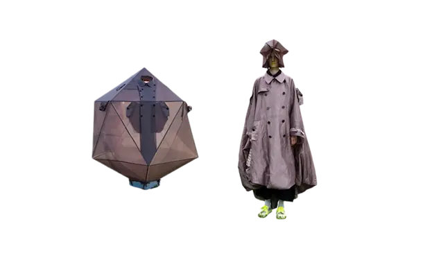 ホームウェア。 衣と住を繋ぐもの。 服と家を繋ぐもの。 球体、4面体、6面体、8面体、12面体、20面体という6つの多面体をベースにて、洋服を移動可能な家として捉えた。全て特別に開発されたネオンの抗ウイルステキスタイルで作られている。 洋服は体の全部を覆うわけではない。 どんな洋服を着ても体の一部は露出される。 家は体の全部を覆ってくれる。 家にいることで、人は守られる。 完全に覆われているという安心感は、完全に防御されているという安心感と同じであるかもしれない。 しかし、家の壁には、自分に寄り添うような安堵感はない。 頭の先から足の先まですっぽり覆う、まるで小さな家のような服。 巻貝の殻に収まるヤドカリは、体が大きくなれば、 別の大きな殻を探さなければならない。 その場合、巻貝の殻は家なのか、服なのか。 住んでいるのか、着ているのか。 どちらでもありそうで、どちらでもなさそうで、 そのあいまいさを服に置き換えたいと思った。 富士山の麓、朝霧自然公園の田園的な風景の中、カラフルな三角形に配置された立体の多面体形のテントを集落に見立てて設置した。これらのテントはとても大きく、ソーシャルディスタンスを保つため直径2mのパターンで設計されている。これらのテントは、民族的なパッチワークのボリューミーなシャツドレスやコートへと変わる。 骨格を入れると2メートルのパーソナルスペースを確保し、空間に変化するが、 骨格を外し、ドローコードでギャザーを寄せて括ることにより、空間は服に変わる。 洋服は全て折りたたみ可能である。フラットな状態に戻すと、紐はまた洋服の一部へと戻る。変形するボリュームはドローコードによりギャザーが寄せられ、ドレープが流れより、空間の硬質さとは対極の柔らかなルックへとなる。 建築家の隈研吾が、人が身につけられる小さな建築としてデザインしたヘッドアーキテクトは、インテリアのランプシェードにもなる。フューチャリスティックな透明のスニーカーはスピングルとのコラボレーションによるもの。ハンドバッグやレザーのスクエアバッグ、キャンバス地のトートバッグなどドライフラワーが施された透明の樹脂ハンドルがついた10種類ものバッグやアクセサリーが“ANEVER”という新ブランドとして今回お披露目された。 ホームという言葉の語源には、 “最終的に戻ってくる場所”という意味がある。 今回のコレクションには、アンリアレイジの出発点であり、原点ともいえるテーマを凝縮させた。 2009年春夏コレクション「〇△⬜ 」、2013年春夏コレクションの「BONE」、2016春夏コレクションの「REFLECT」、2019年春夏コレクションの「CLEAR」そして、ショーはラストルックに近づくと面が多面につなぎ合わされ、パッチワークとなる 過去のコレクションから離れ、遠くへ行きたいと願っていたが、原点回帰していたことになったコレクション。このコレクションはアンリアレイジの原点であり、ホームである。 帰る場所、そして守られる場所としての家 家のような服。服のような家