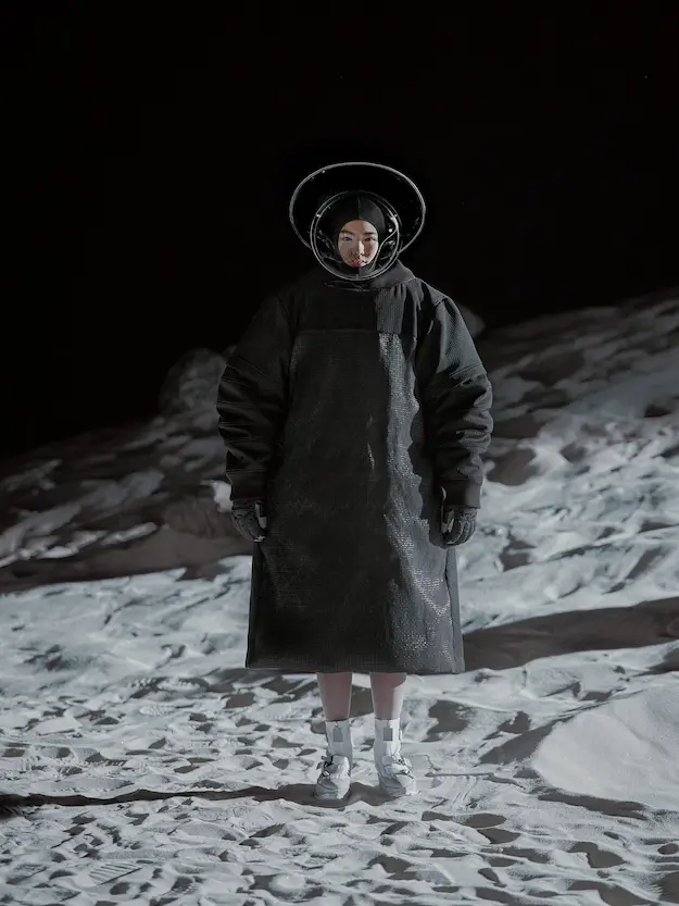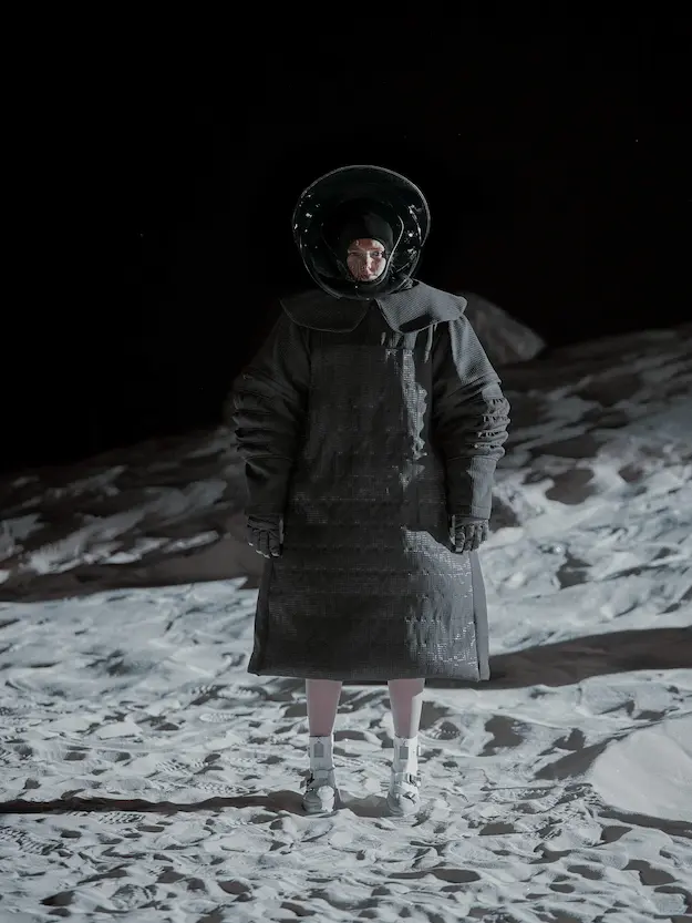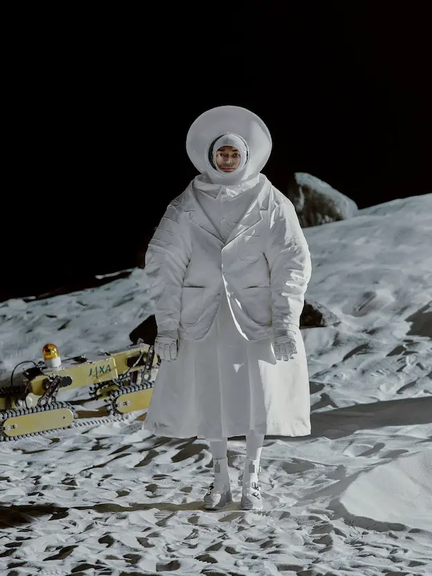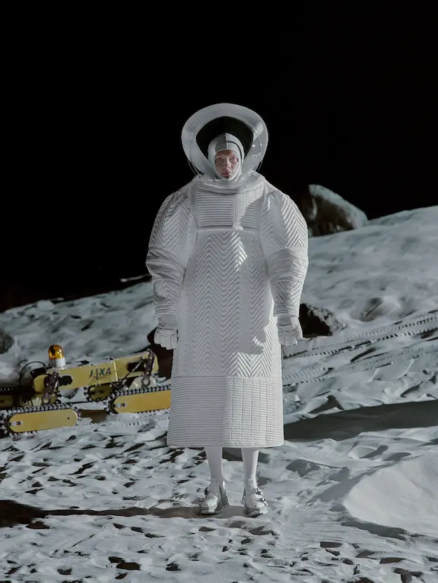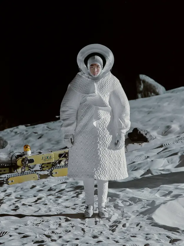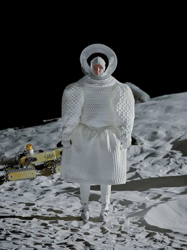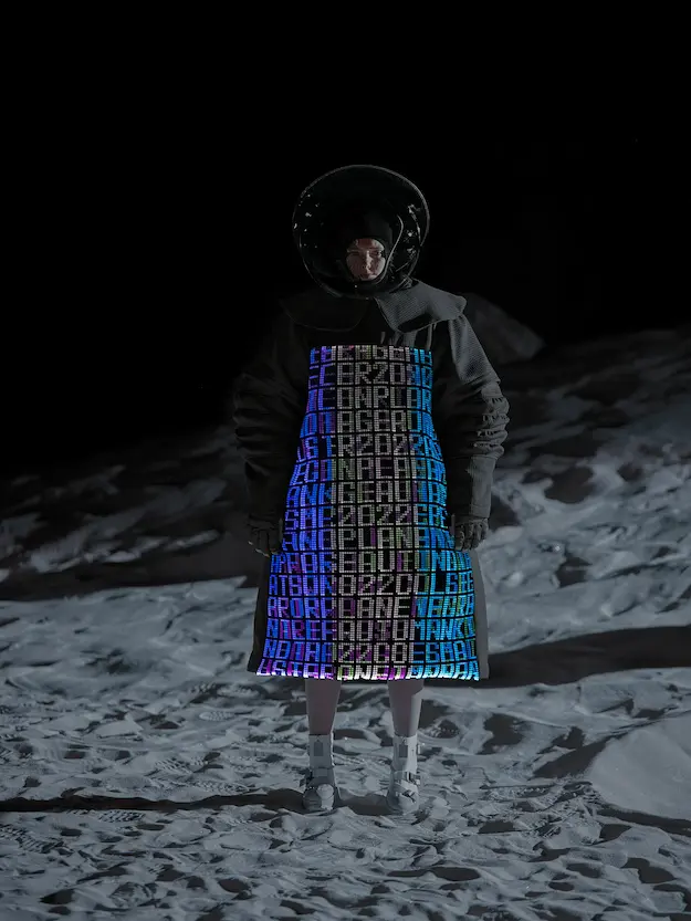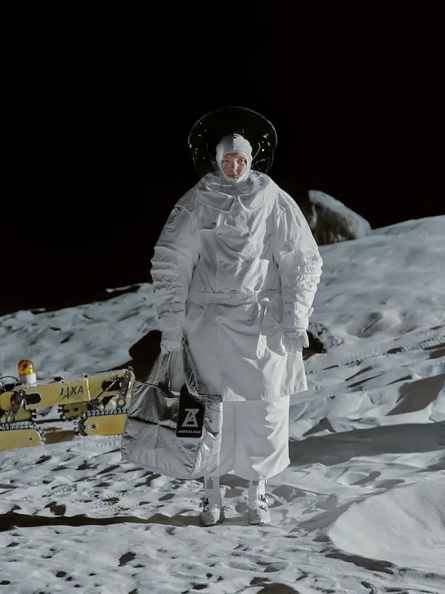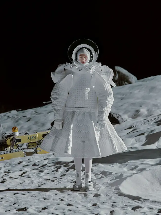 ■ 月は非日常、そこから見える星は地球。 地球は日常、そこから見える星は月。 地球から月へ。 月から地球へ。 ひとつの服が、星と星を繋ぐ ────────── ショーは月面着陸の一歩から始まる。 2030年、384,400kmの距離を超えて、モデルが月面に降り立つ。 月面には惑星地球から来た人類の足跡が残る。 モデルは宇宙服のように膨らんだフォルムの真っ白な洋服に身を包む。 地球の6分の1の重力で浮遊しながら、ムーンウォークでランウェイを歩く。 地球での日常服であるアランセーターやデニムジャケット、トレンチコートなどは、宇宙服に着想を得たディテールに置き換えられる。 記号的な正円のネックラインや正円のアームホール、身体が拡張されたようなボリュームのある円筒シルエットで服が構築される。 ベビードールドレスやコートのキルティング、ジャンプスーツ、MA-1、スタジャンには、NASAが開発したマイナス196℃をも断熱する宇宙 服用の素材「エアロゲル」を内蔵している。 空気も水もない宇宙空間では、まるで小型の宇宙船のように服が体を守る装置となる。 ■ 月が翳ると、4体の黒いドレスが同じ方向を向いて並ぶ。 遥か彼方の地球から遠隔操作され、模様や文字など情報が伝達できる服。 液晶ディスプレイのようなテキスタイルは繊細な光ファイバー糸で織られ、柔軟でしなやか。白く発光し、のちに虹色に煌めき、その表現は 変幻自在。 ラストルックには「THE EARTH WAS BLUE」の文字が点滅する。 やがて月に「地球の出」の時刻が訪れる。昇りゆく青い地球がヘッドカプセルに映り込む。 多国籍な、しかし同じ星からやってきたモデルたちが、ひとつの同じ故郷、地球を眺める。 ■ 月から地球へ戻り、モデルたちが月の光に照らされた砂浜を歩く。 身に纏っているのは月面で着ていた服と同じものだが、地上では重力の影響を受けて膨らみが萎み、そのシルエットは一変する。 キルティングドレスやコートの肩やジャンプスーツのウェストラインは落下し、ドレープやギャザーが服に生まれる。 宇宙服から地球服へ。 星と星を繋ぐ服に、平和への祈りを込めて。 2022年3月5日 ANREALAGE 森永邦彦 ■ “Here, men from the planet Earth first set foot upon the Moon. We came in peace for all mankind.” -Neil Armstrong 「惑星地球より来たる人類、ここ月面に降り立つ。 我ら人類の平和のために来たれり」 -ニール・アームストロング