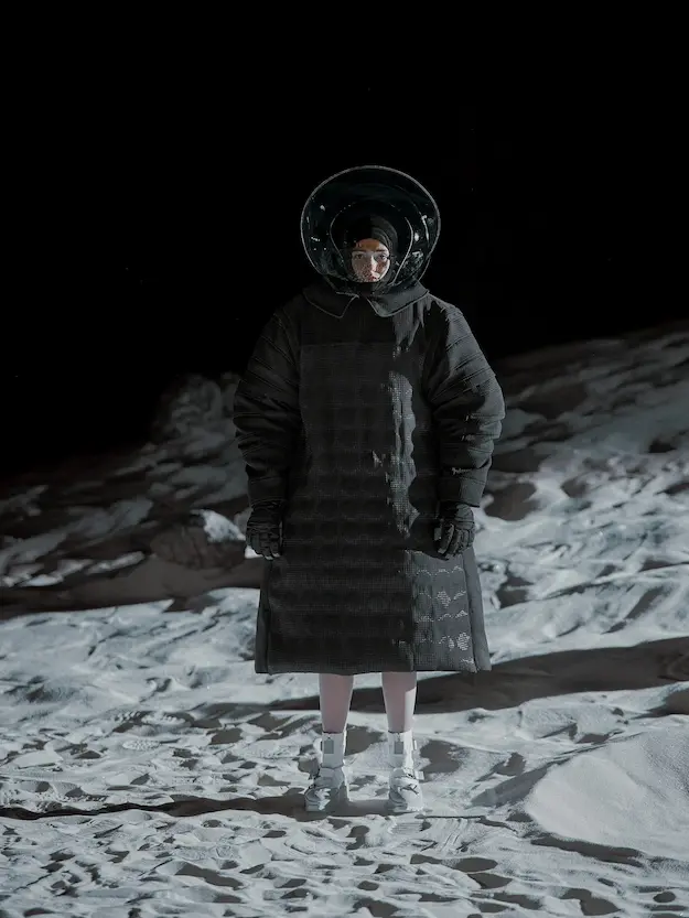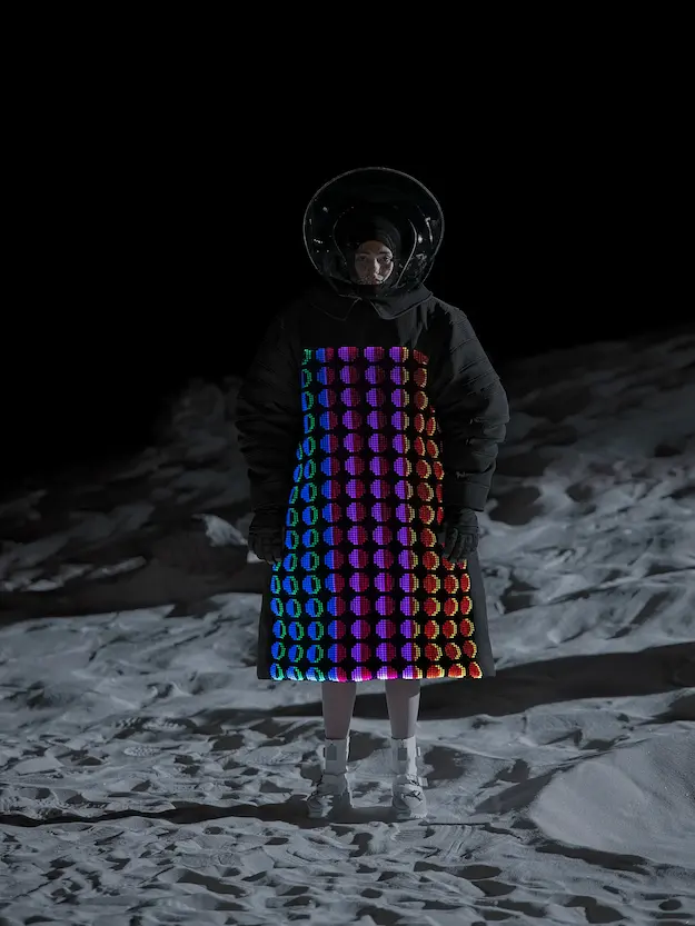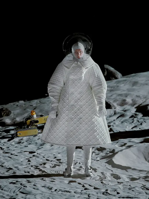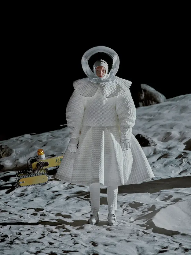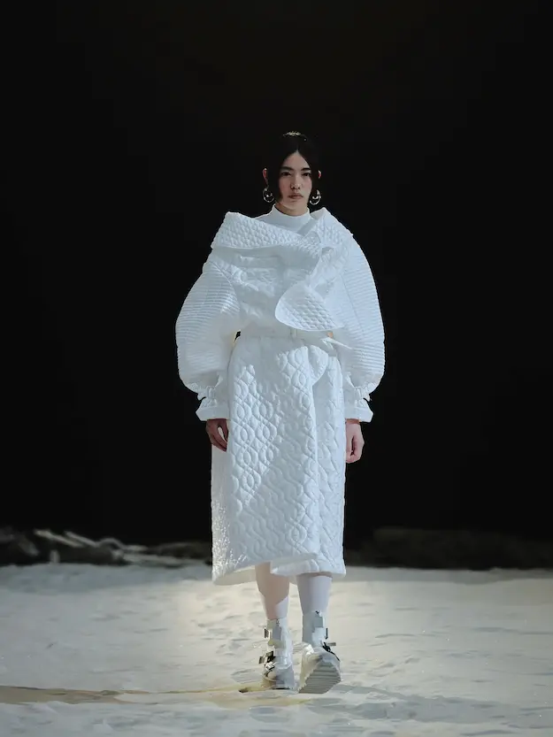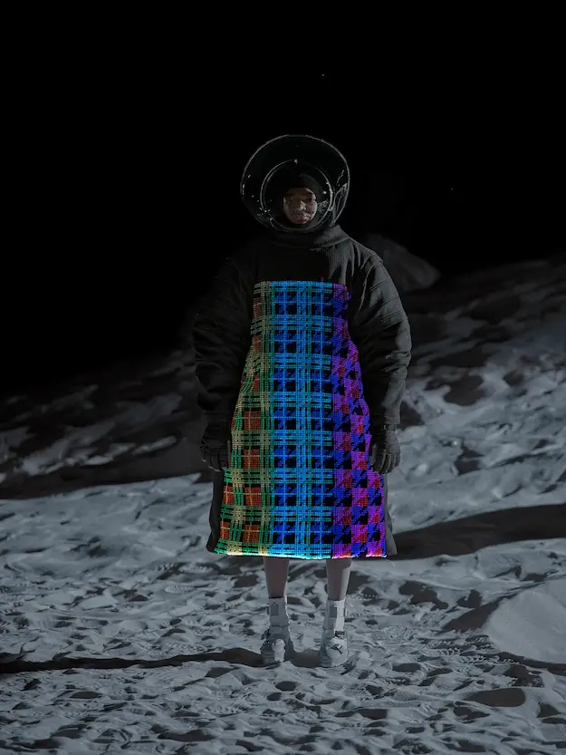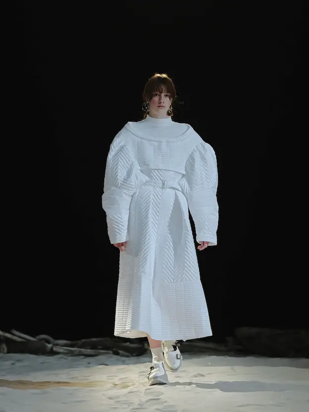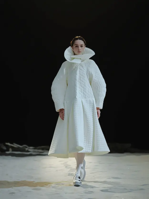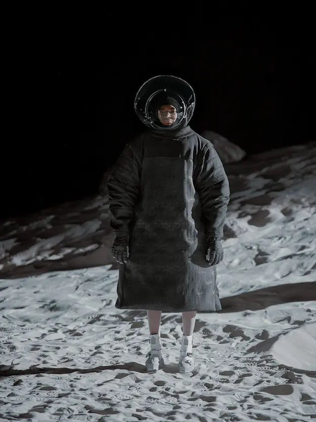 ■ 月は非日常、そこから見える星は地球。 地球は日常、そこから見える星は月。 地球から月へ。 月から地球へ。 ひとつの服が、星と星を繋ぐ ────────── ショーは月面着陸の一歩から始まる。 2030年、384,400kmの距離を超えて、モデルが月面に降り立つ。 月面には惑星地球から来た人類の足跡が残る。 モデルは宇宙服のように膨らんだフォルムの真っ白な洋服に身を包む。 地球の6分の1の重力で浮遊しながら、ムーンウォークでランウェイを歩く。 地球での日常服であるアランセーターやデニムジャケット、トレンチコートなどは、宇宙服に着想を得たディテールに置き換えられる。 記号的な正円のネックラインや正円のアームホール、身体が拡張されたようなボリュームのある円筒シルエットで服が構築される。 ベビードールドレスやコートのキルティング、ジャンプスーツ、MA-1、スタジャンには、NASAが開発したマイナス196℃をも断熱する宇宙 服用の素材「エアロゲル」を内蔵している。 空気も水もない宇宙空間では、まるで小型の宇宙船のように服が体を守る装置となる。 ■ 月が翳ると、4体の黒いドレスが同じ方向を向いて並ぶ。 遥か彼方の地球から遠隔操作され、模様や文字など情報が伝達できる服。 液晶ディスプレイのようなテキスタイルは繊細な光ファイバー糸で織られ、柔軟でしなやか。白く発光し、のちに虹色に煌めき、その表現は 変幻自在。 ラストルックには「THE EARTH WAS BLUE」の文字が点滅する。 やがて月に「地球の出」の時刻が訪れる。昇りゆく青い地球がヘッドカプセルに映り込む。 多国籍な、しかし同じ星からやってきたモデルたちが、ひとつの同じ故郷、地球を眺める。 ■ 月から地球へ戻り、モデルたちが月の光に照らされた砂浜を歩く。 身に纏っているのは月面で着ていた服と同じものだが、地上では重力の影響を受けて膨らみが萎み、そのシルエットは一変する。 キルティングドレスやコートの肩やジャンプスーツのウェストラインは落下し、ドレープやギャザーが服に生まれる。 宇宙服から地球服へ。 星と星を繋ぐ服に、平和への祈りを込めて。 2022年3月5日 ANREALAGE 森永邦彦 ■ “Here, men from the planet Earth first set foot upon the Moon. We came in peace for all mankind.” -Neil Armstrong 「惑星地球より来たる人類、ここ月面に降り立つ。 我ら人類の平和のために来たれり」 -ニール・アームストロング