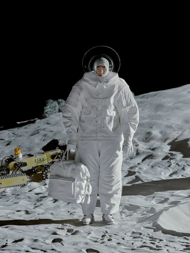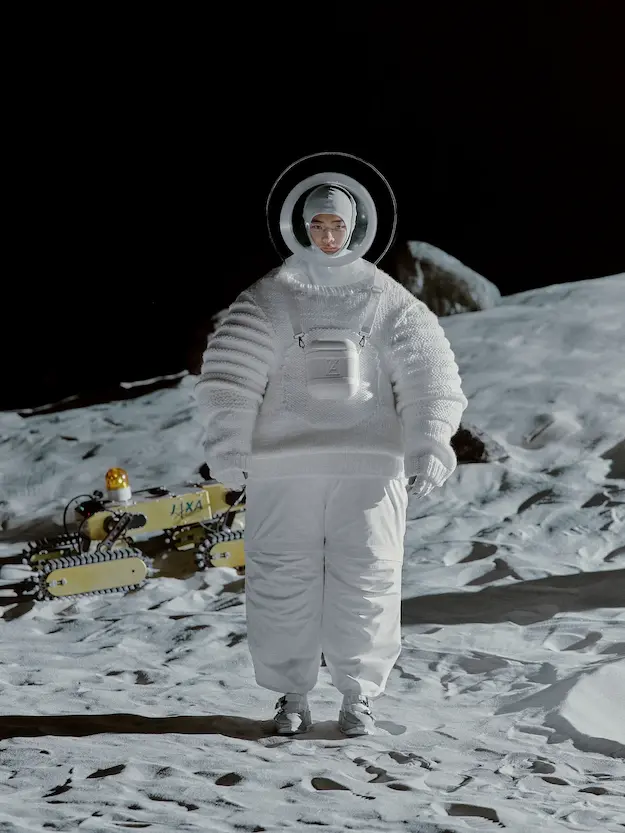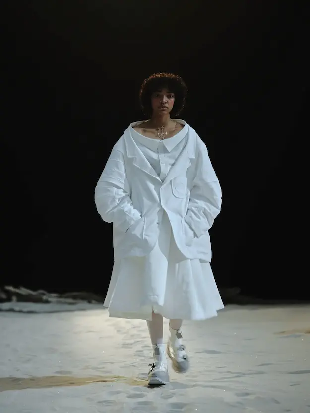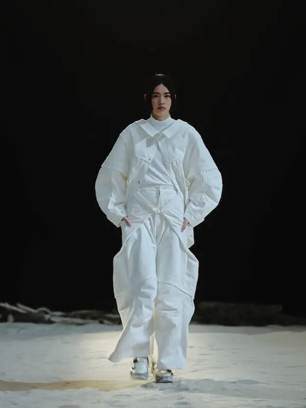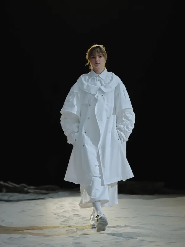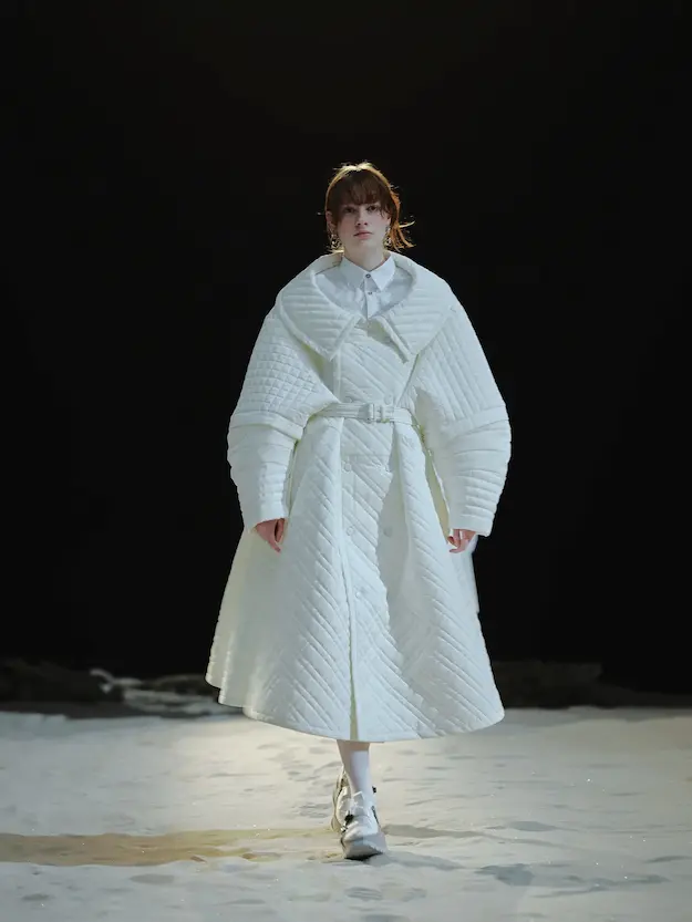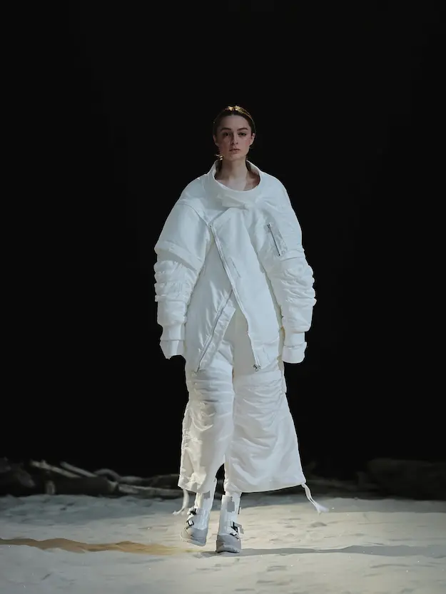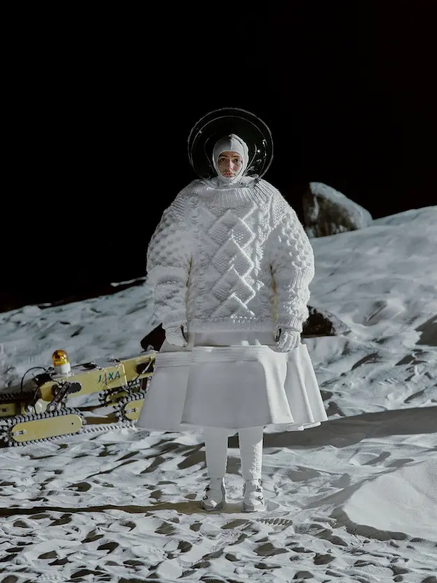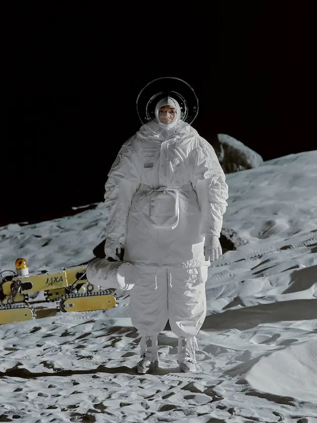 ■ 月は非日常、そこから見える星は地球。 地球は日常、そこから見える星は月。 地球から月へ。 月から地球へ。 ひとつの服が、星と星を繋ぐ ────────── ショーは月面着陸の一歩から始まる。 2030年、384,400kmの距離を超えて、モデルが月面に降り立つ。 月面には惑星地球から来た人類の足跡が残る。 モデルは宇宙服のように膨らんだフォルムの真っ白な洋服に身を包む。 地球の6分の1の重力で浮遊しながら、ムーンウォークでランウェイを歩く。 地球での日常服であるアランセーターやデニムジャケット、トレンチコートなどは、宇宙服に着想を得たディテールに置き換えられる。 記号的な正円のネックラインや正円のアームホール、身体が拡張されたようなボリュームのある円筒シルエットで服が構築される。 ベビードールドレスやコートのキルティング、ジャンプスーツ、MA-1、スタジャンには、NASAが開発したマイナス196℃をも断熱する宇宙 服用の素材「エアロゲル」を内蔵している。 空気も水もない宇宙空間では、まるで小型の宇宙船のように服が体を守る装置となる。 ■ 月が翳ると、4体の黒いドレスが同じ方向を向いて並ぶ。 遥か彼方の地球から遠隔操作され、模様や文字など情報が伝達できる服。 液晶ディスプレイのようなテキスタイルは繊細な光ファイバー糸で織られ、柔軟でしなやか。白く発光し、のちに虹色に煌めき、その表現は 変幻自在。 ラストルックには「THE EARTH WAS BLUE」の文字が点滅する。 やがて月に「地球の出」の時刻が訪れる。昇りゆく青い地球がヘッドカプセルに映り込む。 多国籍な、しかし同じ星からやってきたモデルたちが、ひとつの同じ故郷、地球を眺める。 ■ 月から地球へ戻り、モデルたちが月の光に照らされた砂浜を歩く。 身に纏っているのは月面で着ていた服と同じものだが、地上では重力の影響を受けて膨らみが萎み、そのシルエットは一変する。 キルティングドレスやコートの肩やジャンプスーツのウェストラインは落下し、ドレープやギャザーが服に生まれる。 宇宙服から地球服へ。 星と星を繋ぐ服に、平和への祈りを込めて。 2022年3月5日 ANREALAGE 森永邦彦 ■ “Here, men from the planet Earth first set foot upon the Moon. We came in peace for all mankind.” -Neil Armstrong 「惑星地球より来たる人類、ここ月面に降り立つ。 我ら人類の平和のために来たれり」 -ニール・アームストロング