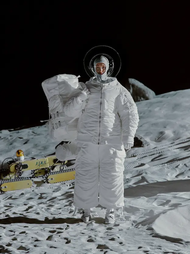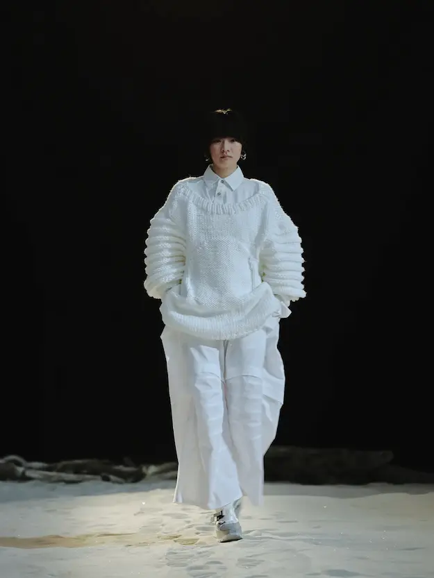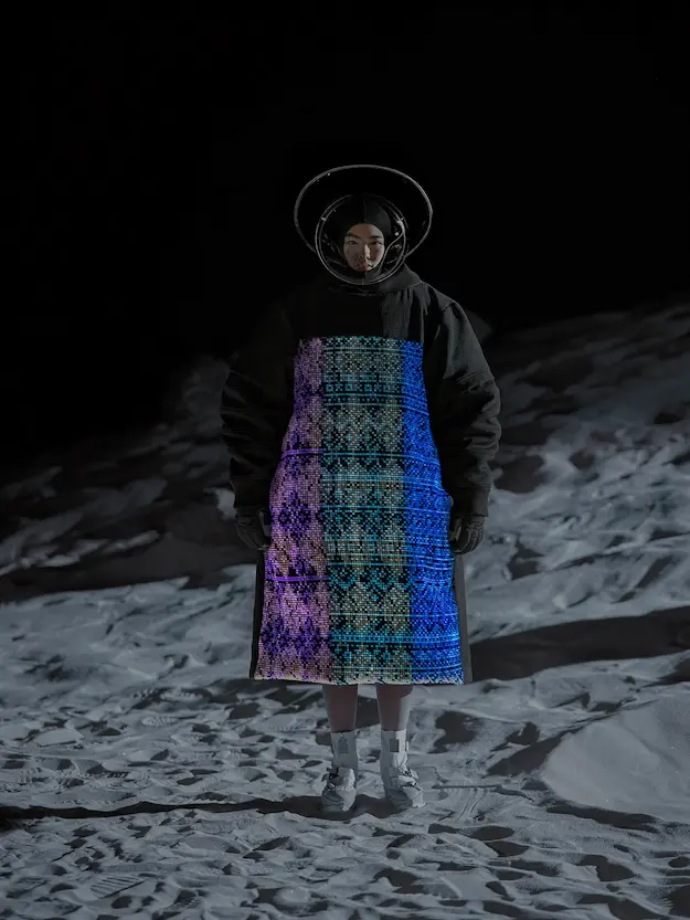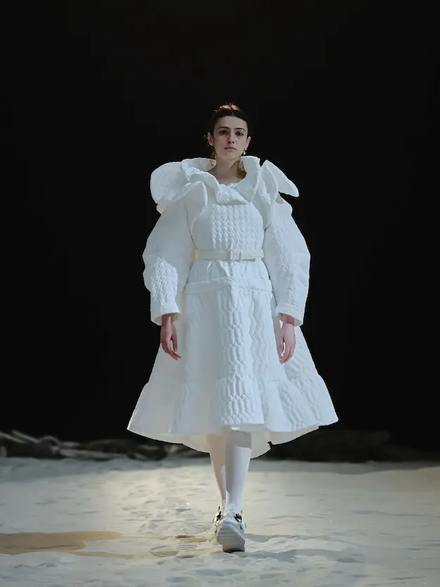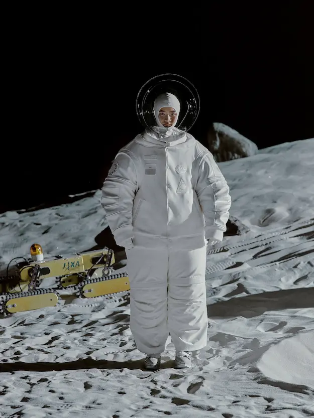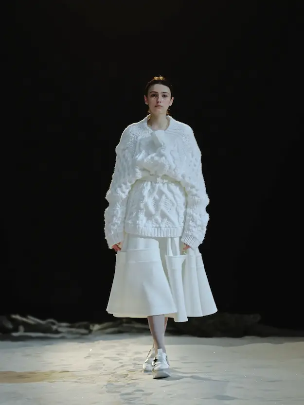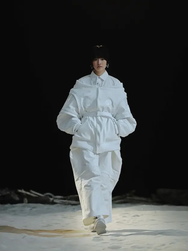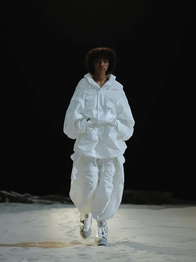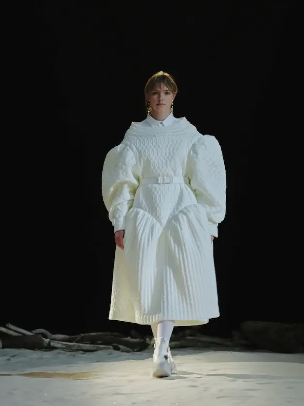 ■ 月は非日常、そこから見える星は地球。 地球は日常、そこから見える星は月。 地球から月へ。 月から地球へ。 ひとつの服が、星と星を繋ぐ ────────── ショーは月面着陸の一歩から始まる。 2030年、384,400kmの距離を超えて、モデルが月面に降り立つ。 月面には惑星地球から来た人類の足跡が残る。 モデルは宇宙服のように膨らんだフォルムの真っ白な洋服に身を包む。 地球の6分の1の重力で浮遊しながら、ムーンウォークでランウェイを歩く。 地球での日常服であるアランセーターやデニムジャケット、トレンチコートなどは、宇宙服に着想を得たディテールに置き換えられる。 記号的な正円のネックラインや正円のアームホール、身体が拡張されたようなボリュームのある円筒シルエットで服が構築される。 ベビードールドレスやコートのキルティング、ジャンプスーツ、MA-1、スタジャンには、NASAが開発したマイナス196℃をも断熱する宇宙 服用の素材「エアロゲル」を内蔵している。 空気も水もない宇宙空間では、まるで小型の宇宙船のように服が体を守る装置となる。 ■ 月が翳ると、4体の黒いドレスが同じ方向を向いて並ぶ。 遥か彼方の地球から遠隔操作され、模様や文字など情報が伝達できる服。 液晶ディスプレイのようなテキスタイルは繊細な光ファイバー糸で織られ、柔軟でしなやか。白く発光し、のちに虹色に煌めき、その表現は 変幻自在。 ラストルックには「THE EARTH WAS BLUE」の文字が点滅する。 やがて月に「地球の出」の時刻が訪れる。昇りゆく青い地球がヘッドカプセルに映り込む。 多国籍な、しかし同じ星からやってきたモデルたちが、ひとつの同じ故郷、地球を眺める。 ■ 月から地球へ戻り、モデルたちが月の光に照らされた砂浜を歩く。 身に纏っているのは月面で着ていた服と同じものだが、地上では重力の影響を受けて膨らみが萎み、そのシルエットは一変する。 キルティングドレスやコートの肩やジャンプスーツのウェストラインは落下し、ドレープやギャザーが服に生まれる。 宇宙服から地球服へ。 星と星を繋ぐ服に、平和への祈りを込めて。 2022年3月5日 ANREALAGE 森永邦彦 ■ “Here, men from the planet Earth first set foot upon the Moon. We came in peace for all mankind.” -Neil Armstrong 「惑星地球より来たる人類、ここ月面に降り立つ。 我ら人類の平和のために来たれり」 -ニール・アームストロング